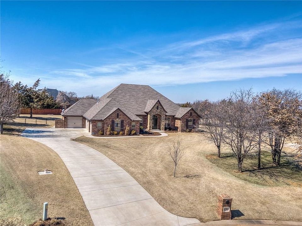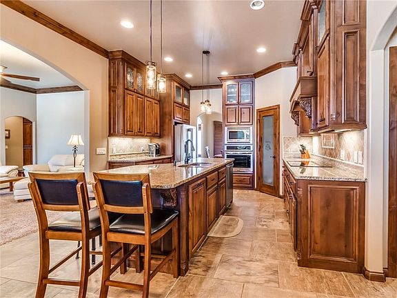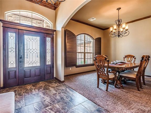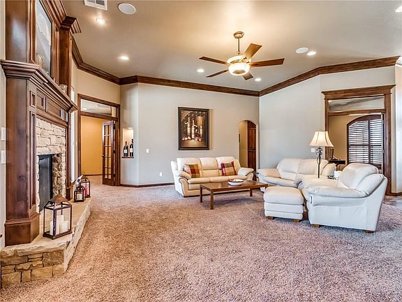 This is a beautifully built custom home finished in 2015 that sits on a little over an acre. It has a large outdoor living space featuring an in-ground pool with a slide, built-in grill, hot tub with privacy pergola, and a firepit. The oversized three car garage has a separate fourth bay that houses the 6-8 person storm shelter. The large master bedroom comes with a spacious ensuite master bath and walk-in closet. The other two bedrooms both have access to the second bathroom. Along with the three bedrooms, there is a study with wood floors and built-in bookcases and an extra living area off of the main living room that is perfect for a den or game room. The house has beautiful finishings with stained molding and high-end window treatments throughout.