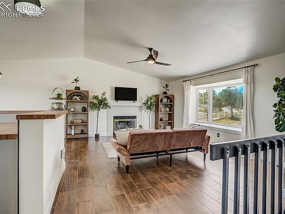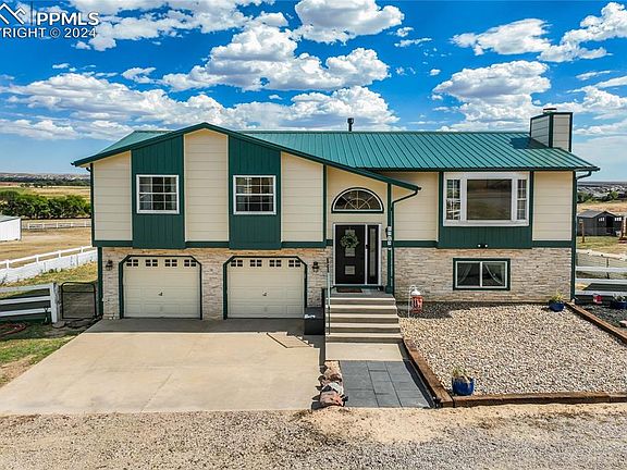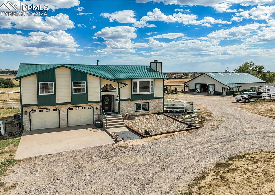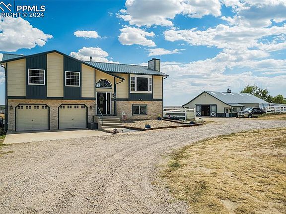 It is rare to find an Elite Equestrian Facility 'in town' with a MORTON barn (60x40), horse arena (160 x 90 *1500 sq feet), and a lovely updated home. As you view this property, you will notice thoughtful, well-designed and beautiful additions. Throughout the whole home, new flooring: wood-look tile & high-traffic carpet. ALL walls & ceilings are finished with a flat/smooth surface finish. Remodeled kitchen includes new cabinets, bespoke refrigerator, dishwasher, range/oven, quartz & the pantry includes additional counterspace for a coffee nook. Baking and Entertaining will be a dream with the breakfast bar - finished with butcher block countertops, dining area, and spacious back deck. The deck will give you optimal views of fireworks as you can see miles around, as well as the front picture window which has a perfectly framed view of the mountains! No need to stand in the cold watching the New Years Firework show from Pikes Peak. Primary bedroom has an accent wall, extended closet, and a new 4 piece spa-like bathroom. Lower level has a lovely area for entertaining or use it as a mother-in-law suite as there is a counter/cabinet area with a sink for a wet bar or mini kitchen. Lower primary suite includes attached spa-like bathroom & walk-in closet. Laundry room on lower level has custom cabinets and quartz. MORTON BARN & MEADOWS: The barn is 60x40ft including 5 feet roof extension on Paddock Side, two 12x12 stables or Broodmare stall or Perfect Dog Runs. Tack room measures 12x12 with tile flooring, saddle racks, bridle racks, fully taped/textured, and has cabinets for additional storage. No Freeze Water Lines, 2 frost free Spigots, Wash Rack Cross Tie, 15 tons of Decomposed Granite. Arena is laser leveled, no climb vinyl fencing. ALL fencing for horses hotwired and is no climb! Additional Shed Row - 3 sided shed covered, 35x12, conveniently between two pastures. Electric hot box located in barn, Solar on North side of home.