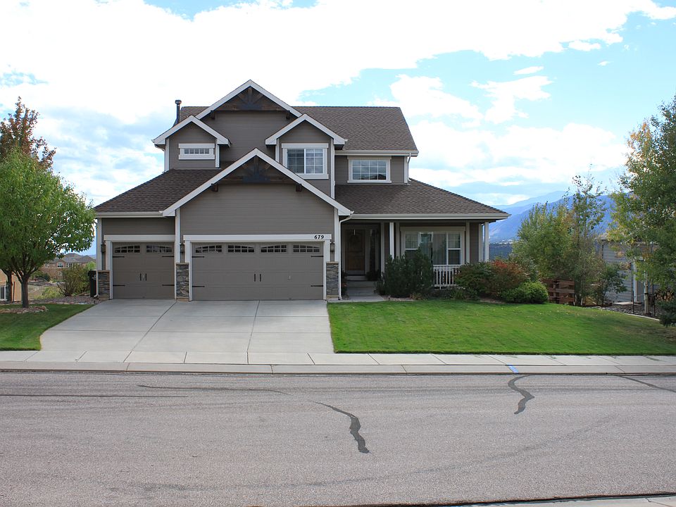 Charming 4+bed/4 bath/3 car with spectacular Front Range views in desirable Jackson Creek! This home has it all! Inviting front porch, hardwood in the foyer, formal living and dining rooms, open kitchen, non-conforming fifth bedroom on the main level with French doors (currently used as an office), 12x14 composite deck with built-in canopy that partially covers the 30x14 concrete patio below. Amazing Master suite with additional sitting area to take in those Pikes Peak and mountain views. Walk-out basement with wet bar. Such a great floor plan! Tons of cabinet storage in the kitchen with large island and additional sitting area. Gas fireplace in the main level family room. Two spacious bedrooms upstairs with an immaculate Jack-and-Jill full bath with double vanity. Additional bedroom suite in the basement with double closets and adjoining full bath. Large family room downstairs with gas fireplace and upgraded wet bar. Unfinished storage area could convert into additional bedroom.