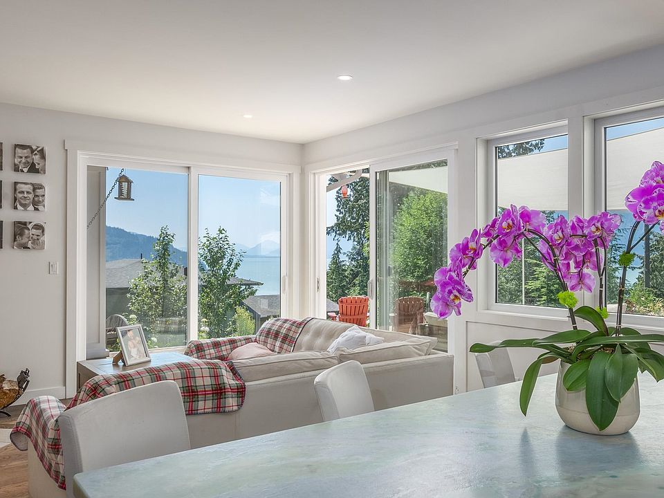 Britannia Beach Custom Craftsman with Views! This charming home on an expansive lot offers ocean & mountain vistas surrounded by mature trees. Cozy yet spacious interior with high-end finishes & hardwood. Open main floor living/dining with 1 bed & 1 bath. Upstairs: 3 beds incl. primary suite w/ large ocean-view patio, laundry, bath. Enjoy the wrap-around deck with 2 areas, BBQ & fire pits, lush gardens! Perfect family home. Granite, European windows, wood fireplace, double garage. Call for private showing!