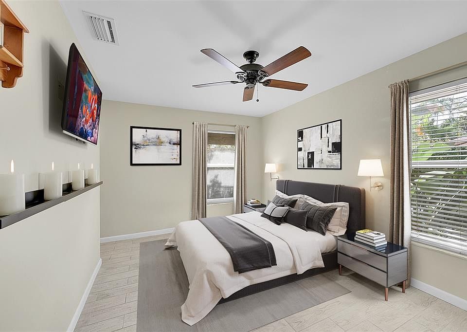 Embrace the Palm Beach lifestyle without breaking the bank! This beautifully updated 2-bedroom, 2-bath villa is perfect for anyone 55+ seeking relaxation, style, and community. Enjoy a partially furnished modern inspired interior with wood-like tile throughout, quartz countertops, wood cabinets, stylish bathrooms and a Zen garden patio for evening chats around the firepit or morning coffee and meditation. The Impact windows and doors provide added peace of mind. With LOW maintenance fees and NO assessments, Cable TV and fantastic community amenities included for you to enjoy! This villa is the perfect mix of comfort, style, and accessibility. Come live the FL lifestyle you deserve!