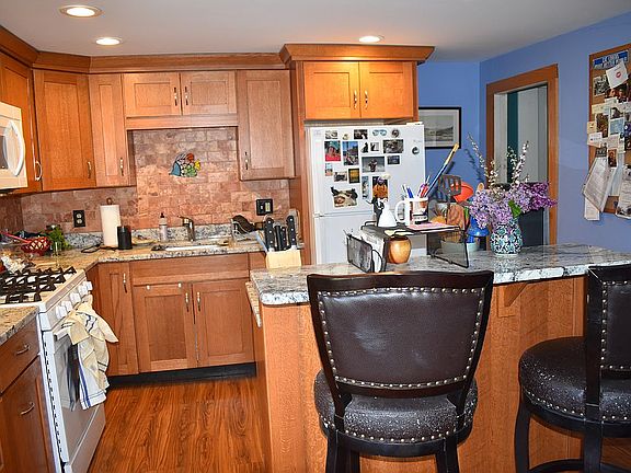 Charming New Englander farmhouse has had many nice upgrades during their 41 years of ownership. Upgrades include: upscale kitchen with marble countertops, center island and newer appliances, fully tiled full bath, replacement windows, newer Oil furnace and oil tank, on-demand propane hot water heater, sump pump, whole house rewire, PT sills and floor joists, replacement 3 bed septic system (2007), drilled well and wrap around deck. Cozy floorplan gives lots of flexibility. Enter the large 2 room living room via the convenient enclosed porch off the driveway. Main floor bedroom. The kitchen opens into the dining area, full bath, and office which also has the laundry area as well as an inside Hot tub! Upstairs in the main house are 2 bedrooms. Continuing from the office into the rear of the house into the large library with upstairs finished attic bedroom. Beyond the library is the attached barn. The barn offers lots of space for storage and your hobbies. Downstairs in the walk out basement level, goats were previously housed. The yard slopes down gradually to a brook that makes up the rear boundary line and vegetable gardens grow in the side yard. There is a detached oversized one car garage as well as an old "sauna" shed for additional storage or animals. Classic VT farmhouse looking for its next owners!