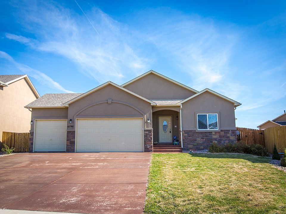 Beautiful Windsor Ridge home located in Lorson Ranch* This home is in an excellent growing neighborhood close to Fort Carson, Peterson and nearby to shopping amenities by Mesa Ridge* Exterior is full stone and stucco for easy maintenance* A long stained driveway leads you up to an over-sized 3 car garage* The backyard has extra concrete for the patio making it perfect for entertaining* Whole house does have central air which will come in handy during our hot summer days* Inside you have a tile floor entry* Wood floors flow through the hallway and into the open concept kitchen,dining, and living room* The Gourmet kitchen has tall vaulted ceilings extending over the great room* SS appliances come with the home including a wine fridge* Granite counter-tops make you feel like you are cooking in a chef's Kitchen* The island has plenty of space for counter bar seating and there is extra storage in the pantry* The great room does have a cozy gas fireplace to nestle around* There are 2 bedrooms on the main floor* The 2nd bedroom is near the entry and makes use of the full bath next to it* The Master bedroom has tall vaulted ceiling with its own walk out to the backyard* Master adjoins to a 5 piece bath with a double vanity that has granite counter-tops* There is also a soaking tub, free standing shower, and large walk in closet* The basement is fully finished with TALL 10 foot ceilings making the space feel very large* The rec room is multi zoned for different purposes* 2 additional bedrooms are in the basement along with another full bath*