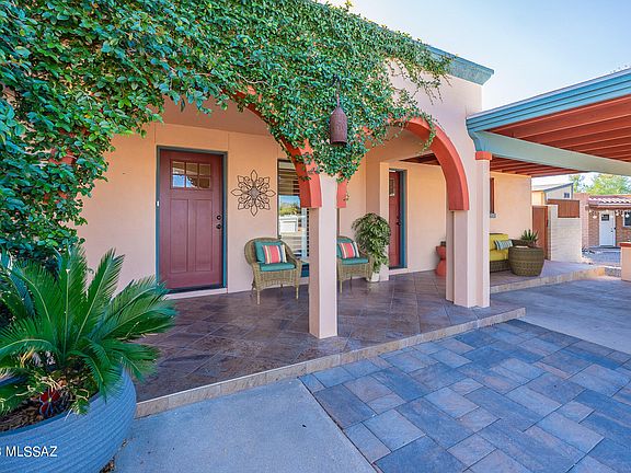 Located on a cul-de-sac in the iconic El Gheko neighborhood on Tucson's near-eastside, this updated and well-maintained home is ready for a new owner. So many features to love: Owned Solar, Newer Pool, Lovely Landscaping, No HOA, & Charm-Galore. The sellers have paved a spot for a travel trailer (up to 40 feet), updated the kitchen with quartz countertops and a subway tile backsplash, remodeled the hall bathroom, added new tile flooring in the living room & carpet in the guest bedrooms. The backyard is nicely landscaped and has storage sheds (one is cooled and is supplied by an exterior outlet), an orange tree, gazebo and a refreshing pool. The side yard has a citrus grove - mandarin, tangerine, lemon & grapefruit trees. Call for a showing today!