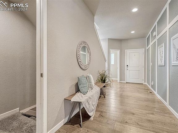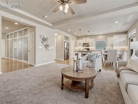 Immaculately maintained home w/fully finished basement, oversized Primary Suite, and gorgeous gourmet Kitchen in desirable Banning Lewis Ranch. This light-filled 4BR/3.5BA residence warmly welcomes with durable vinyl siding, an inviting covered front porch, and low-maintenance landscaping. The foyer further delights with faux wood luxury vinyl flooring, stylish accent wall, convenient powder room & coat closet. Perfect for entertaining and everyday living, the open concept gourmet Kitchen features an enormous breakfast bar island with quartz countertops, 42” cabinets, gas stove, French door refrigerator, undermount stainless-steel sink, walk-in pantry, built-in microwave, dishwasher, Dining area, & adjoining Great Room with tray ceilings & lovely views of the outdoor space. Relax in the low-maintenance fenced-in backyard, which has a stamped concrete patio & newer turf (2021). Upper level features a huge loft/potential home office, large storage closet, two additional Bedrooms, full hallway bathroom, and Primary Suite. Enjoy privacy & serenity in the oversized Primary Bedroom, which includes walk-in closet & Ensuite Bath featuring a dual sink vanity & step-in shower. The finished basement delivers versatility with a family room/rec room, one more sizable Bedroom, Bathroom with step-in shower, and tons of storage. Additional considerations include an attached two-car garage with overhead storage, mudroom area, second-floor laundry room with W/D and folding area, plus upgraded furnace for greater efficiency. Banning Lewis Ranch amenities incl the Ranch House w/fitness and meeting centers, outdoor pools, acres of parks/trails/open space, climbing park, splash pad, seasonal waterpark, dog park, pickleball courts, tennis courts, community garden, Banning Lewis Ranch Academy. Close to Peterson AFB, Schriever AFB, Fort Carson, entertainment, hospitals, & shopping. Easy access to the Powers Corridor & I-25 for commuting to Denver & downtown Colo Spgs.