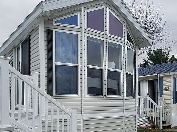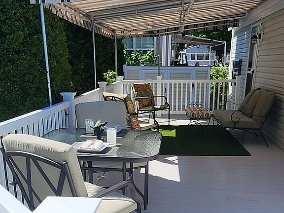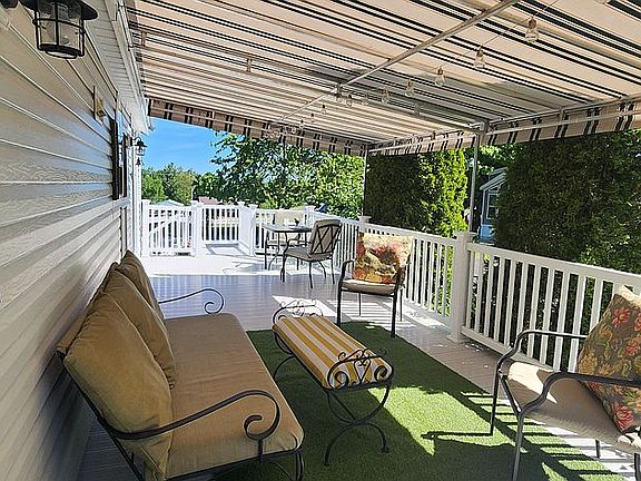 This thriving community is great for year-round living, weekend get-away, or rent it out! You OWN your own property! The corner lot features a 21' X 10' composite deck with a 17' X 10' canvas awning. Home offers new vinyl plank flooring, new metal roof & skylight, new kitchen sink/faucet, new bathroom sink/vanity, landscaped with mature cedars, lilacs, and a pincherry tree for privacy. Amenities include Spectrum TV & Wi-Fi, water, sewer, garbage pickup, roads, snow plowing, 30' X 60' heated pool, clubhouse with game room, library, 24 hr. restrooms with showers, pickleball/tennis/basketball courts, shuffleboard & horseshoes! Lot offers a 2-car parking area. Boat, trailer, camper storage available without fee - see park manager.