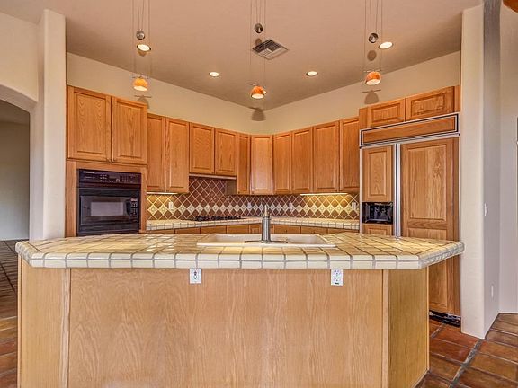 Peaceful Santa Fe Style Home with private gated courtyard entry & 3 car garage. Meticulous curb appeal & nestled on almost an acre of land surrounded by breathtaking Mountain Views on a cul-de-sac lot. Dramatic entry with viga columns, rounded arches, art niches, Saltillo tile, French doors to patio, & neutral palette. Old world colorful tile meets modern amenities. Enjoy tiled kitchen counters, center island, breakfast bar, pendant lighting, black appliances, tiled backsplash, & wood cabinets with hardware. Open floorpan. Wood beam ceiling in family room, fireplace in master & living rm, carpet in all the right places, & ceiling fans. Generous size bedrooms, ample closets, plantation shutters/window blinds, & 2.5 baths. Bold mountain & city light views. Fresh paint in & out. utility sink and storage cabinets. Bonus/Game room with endless possibilities. Peaceful & serene backyard setting boasts covered pavered patio, shade trees, pavered dining patio, built-in BBQ, and vast views. See it...Love it...Live it!!!