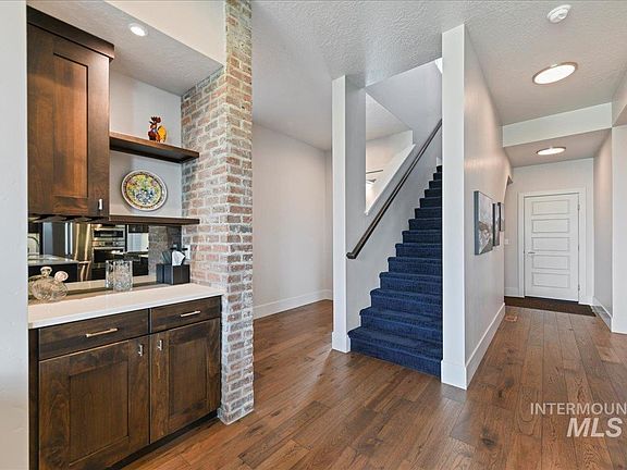 Home sits on the rim of the Boise River with views of the River basin & foothills. Full brick wall leads you to the open & airy great room featuring 10’ ceilings, expansive windows framing in incredible serene views and lots of natural light. full brick fireplace, built-in shelves, entertainment bar, Kitchen made for gathering w/large island, custom alder cabinets, quartz counters, 6 burner industrial range, built-in wall oven & micro, walk-in butler’s pantry. Beautiful hardwood floors to kitchen, great room, dining & powder bath. Flexible layout w/private home gym or office space on main floor, open loft, built-in tech center, or office/study center/arts & crafts. Primary suite featuring oversized picture window w/views of protected Boise River basin. Relax on the weekends while your automatic robotic lawn mower has mowed your lawn. No back neighbors, backs to common area, greenbelt & protected Barber Pool Reserve, & just step away from direct Greenbelt access.