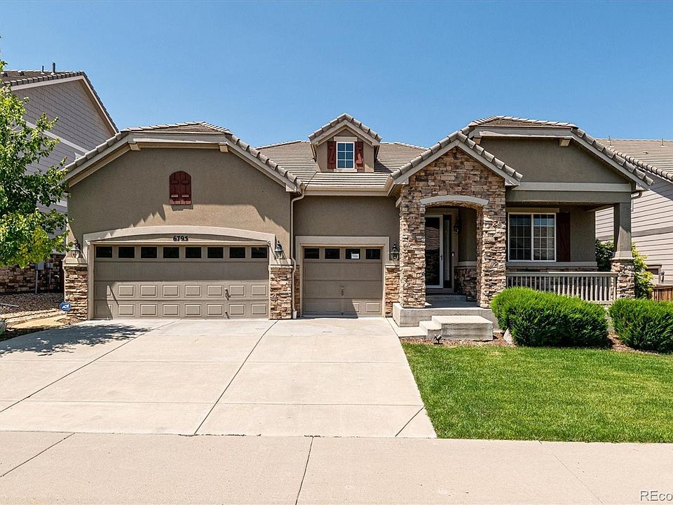 Welcome to 6795 Esmeralda Drive, a stunning 4-bedroom, 3.5-bathroom home nestled in scenic Cobblestone Ranch. Built by Richmond American Homes of Colorado in 2012, this property blends modern comfort with outdoor enjoyment. With a generous 3,701 finished square feet (4,425 total), this home has ample space. The open floor plan seamlessly unites the living room, adorned with a gas fireplace and vaulted ceilings, and a stylish eat-in kitchen with island seating and a garden window. Also find four spacious bedrooms and a versatile office enclosed by French doors. Love to entertain, spill over into the formal dining room which adjoins the kitchen. Ample storage space is provided by walk-in and linen closets, a three-car garage, and additional areas in the finished basement, where you'll find an extra bedroom and bathroom. Experience the convenience of a walk-in tub in the main level full bath. The primary suite features a bay window, two large walk-in closets, a double vanity, private water closet and shower. The exterior doesn't disappoint either: a covered front porch with video doorbell and a backyard featuring a pergola with Trex decking invite you to enjoy Colorado’s beautiful weather. The beautiful Gemstone feature will light up your home with holiday colors as well as provide additional lighting everyday of the year. The lighting is operated solely by your app. Revel in neighborhood amenities such as trails, open spaces, a park, playground, pool, and tennis court. Plus, the HOA covers trash and recycling. With an ideal balance of luxury and functionality, this Castle Rock gem is waiting for you.