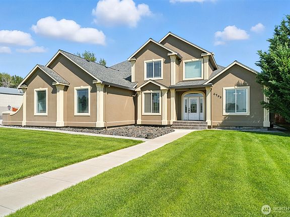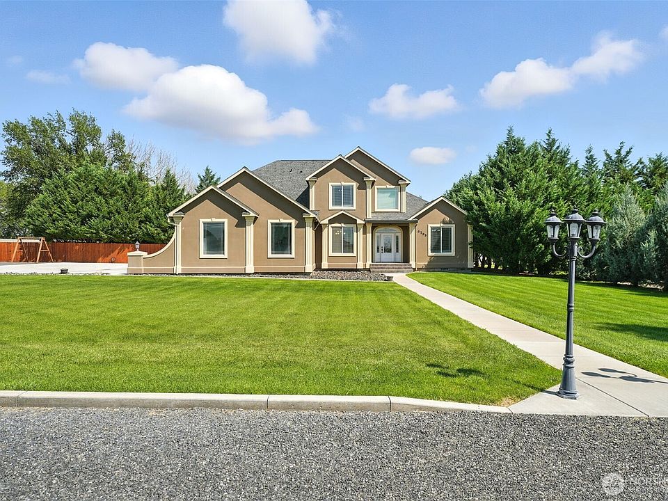 Welcome home to this stunning custom-built estate set on 4.71 fully irrigated acres, surrounded by peaceful orchards. This exceptional 4-bedroom, 4-bath residence offers 3,083 sq ft of thoughtfully designed living space, blending luxury, comfort & privacy minutes from Moses Lake & Ephrata. A grand staircase welcomes you into the dramatic living room featuring soaring 20-foot ceilings & a cozy gas fireplace. The gourmet kitchen is ideal for entertaining, showcasing granite countertops, stainless steel appliances, hickory cabinetry, a casual dining area & a new refrigerator. The main-floor primary suite provides a private retreat with a walk-in closet, jacuzzi tub & walk-in shower. Upstairs are two spacious mini-suites with remodeled bathrooms featuring granite and tile—one complete with a modern smart mirror—along with a fourth bedroom. Additional highlights include new carpet throughout, modern finishes, a built-in vacuum system, 2 hot water tanks, water softener, and a dedicated office/den. Outside, enjoy a covered patio, sun deck, landscaped grounds & apricot trees! New 2024 fencing, full sprinkler system, and valuable Lakeshore Acres water rights. A massive 40x60 insulated shop with 220 outlets, a full bath & living quarters, 8-car/RV parking & multiple outbuildings provide endless opportunities for storage, hobbies, or business use. This remarkable property offers luxury living & true privacy—an opportunity not to be missed. Check out the VIRTUAL TOURS!