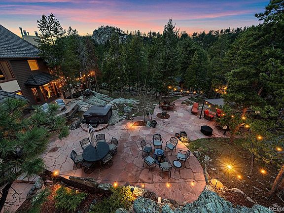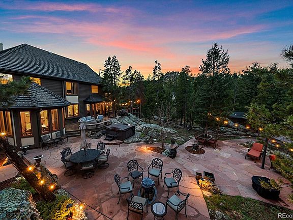 $150k PRICE REDUCTION and move-in ready! This is a truly unique offering in Evergreen in a very private and scenic setting! Behind the illustrious gates of Evergreen's The Timbers neighborhood, the property sprawls across 2.28 acres, yet with a feel of grander expanses, courtesy of vast neighboring parcels, cinematic foothills views & stoic rock formations. Located at the end of the cul-de-sac this is the premier parcel in the neighborhood! With twinkle lights hanging in the forest canopy, your guests can mingle on the many custom patios & decks and expansive gathering areas. A hot tub & custom lighting complete the backyard oasis. Inside, you'll find a seamless blend of indoor/outdoor living space, complete with bespoke bar, 300-bottle wine sanctuary, & gas-fed wood fireplace. Lower level has family rec room with a wood-burning hearth. Custom-built private office with custom shelving, french doors & lightning-fast connectivity of Starlink. Gourmet kitchen w/ KitchenAid stainless appliances, granite countertops, breakfast room, & walk-in pantry. Formal living room has cathedral style floor-to-ceiling windows framed by foothills views. Retreat to the luxurious primary suite where the 2-story custom closet could rival any posh boutique, its own private deck, & living area warmed by gas fireplace. Stay cool all summer long with CENTRAL A/C! Expansive 3-car garage w/ coated floor, tandem space for 4th vehicle or cherished toy, & an abundance of storage solutions. Extremely private yet only minutes from the hip restaurants and shops in downtown Evergreen & a short commute to Denver! Within an hour of many world class ski resorts or DIA. This is Evergreen living at it's finest! VIRTUAL TOUR: https://revlmedia.com/6796-Timbers-Dr