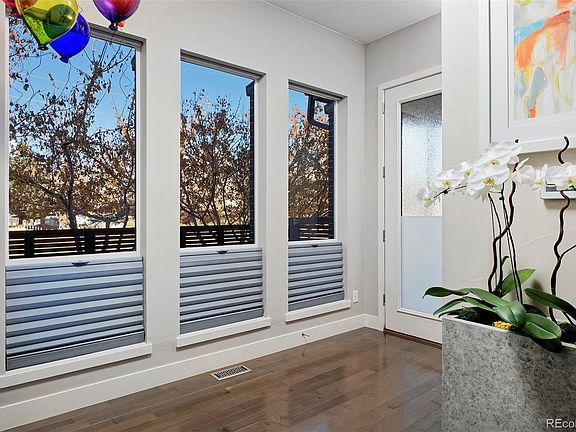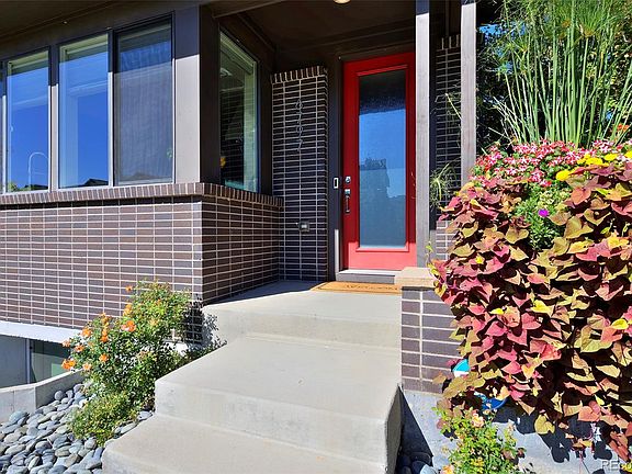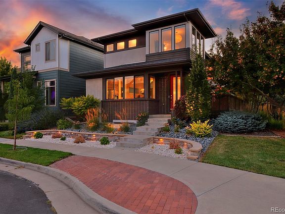 Next level, unlocked! Upgrade to a chic and contemporary standout home in friendly Midtown, just 12 minutes from downtown Denver. This ingenious Brookfield floorplan sits on a spacious corner lot, with ample foliage, custom landscaping, garden lighting and innovative architectural lines. With hardwood floors on the main and upper levels, designer light fixtures, a whole-house speaker system and custom window coverings, just about every corner of this home has bespoke finishes. Head up to your primary suite, which has a spacious sitting area and a clever bathroom layout: a central, European-glass shower is flanked by two individual dressing areas with their own entrances, closets, vanity sinks and toilets. Downstairs is just as dreamy. The kitchen is elevated to greatness with upgraded ceramic tile, high-end granite counters, a sleek island, and a combo of open shelving and enclosed cabinetry for maximum livability. The sunny living room has not one, but three, glass sliders to the spacious side patio for entertaining magic. Completing the main level are a light-filled main-floor office, a mudroom with two huge closets and bench seating, and a garage with large cabinets and the epoxied floors you’ve always wanted. The finished basement is a soft place to land, with recently updated plush carpeting, a large media room, full bedroom and gym nook. Every need is taken care of here at home and amid the perks of Midtown, with multiple parks, community garden plots, a community center, great elementary and Montesorri schools, light rail access, Bruz Beers and the new Earlybird eatery.