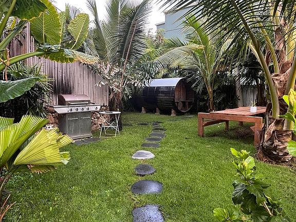 Outside, you will find a large shower, soaking tub, sauna, BBQ, communal table, and shaded board rack in the backyard. The building features a mural by Artist Velia Di Iuliis. Papaya, banana, coconut, and passionfruit can be found growing throughout the property. It is only a 2-minute walk to the beach. One block away is the bike path that connects to Haleiwa Town.