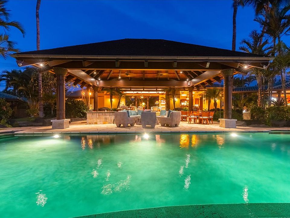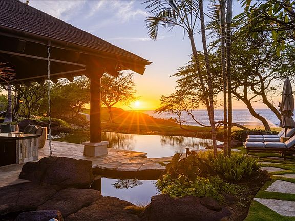 Kilohana sits on a 1.4-acre front-row site at the end of a private drive within the 49 Black Sand Beach neighborhood at Mauna Lani. Honoka’ope Bay, with its black sand beach and private community beach club, is less than a 90 second walk from the home. Overlooking the 7th hole of Mauna Lani’s south course, the property has over 275 feet of frontage on views of the ocean, waves crashing on the shoreline, Maui, and sunsets from four of the bedrooms and all living areas. The improvements are laid out as a small village retreat, with mature landscaping and stone pathways leading to the many private locations on the property, and include a solar field and putting green with a 45-yard pitch to the green. On the south side of the property, adjacent to the golf course buffer, sits the 1,750 square foot ocean view primary suite with a spacious two-station office, two full bathrooms, a large shower garden, and full laundry facilities. On the north side of the property are two detached 3 bedroom, 3 bath, 1,300 square foot guest hale, each with its own laundry facility and between the two hale, are an additional four outdoor shower gardens. The numerous pocket doors throughout beckon you to a 1,656 square foot lanai including a 600 square foot grand covered lanai with wet bar, dining area, sunken barbecue, with smoker and cooktop; almost 8,000 sf of indoor/outdoor living at its best! Large 3 car garage with private entrance, as well. The home was designed by Lucky Bennett and built by Clever Construction to exacting standards, which include mahogany pocket doors, windows, floors and trim, vaulted ceilings, a variety of custom stone and tile used throughout and a lengthy list of designer furnishings and art included in the sale. Meticulously designed and cared for by an owner who is in the real estate development business!