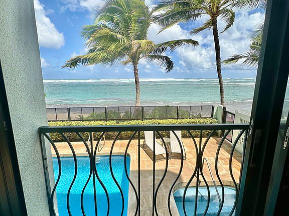 OCEAN FRONT, BEACH FRONT! 2 Bedroom 2 bath Ocean Front, Beach Front, Pool Front, Condo on the North Shore of Oahu. Located in the residential neighborhood of Aweweo Beach Park in Waialua, this condo sleeps 4, has two full baths, a King en Suite with a portable new AC unit. Washer/dryer in the unit, a modern kitchen fit and stocked for the best of cooks. A private parking stall, secured entry, elevator, community pool and spa, beach access and BBQ area. Surf, Paddle, snorkel, view sea life, walk miles of beach just out front! This condo is ideal for a lengthier needed home away from home or a well deserved retreat. Utilities included. Ideal get away, snowbirds, contractors, temporary housing needs.