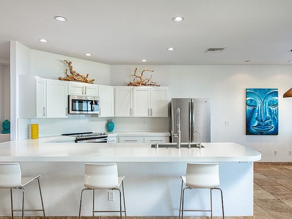 The lanai, great room, and primary bedroom suite underwent a substantial expansion to increase the livable square footage. An office was added during this renovation and all aforementioned rooms have extensive ocean views. The primary bathroom updates included a resort-styled private outdoor shower garden. The open floor plan kitchen features newer quartz countertops. The bedrooms are carpeted while travertine flooring flows throughout majority of the home.