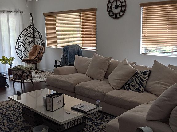 PET FRIENDLY home features 1737 sqft, 3 bedrooms, 2 bathrooms, open floorplan, hardwood flooring in large living room, Master suite with walk in closet and private bath, Kitchen with tile flooring, all electric appliances, Pantry with a barn door, washer and dryer included, a 2 car garage, Lanai off of Master bedroom and kitchen, and solar hot water. Partially furnished with beds, couch, and other items that will not be replaced if they become not operational. Tenant responsible for yardcare and all utilities.