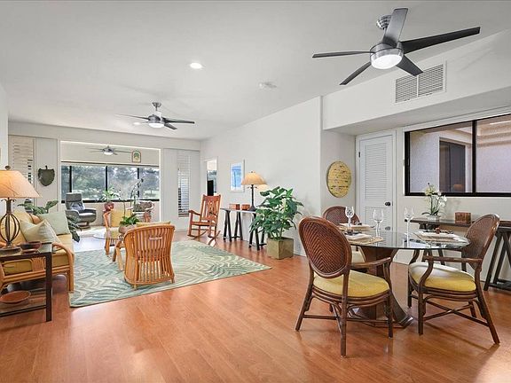 Step inside to discover a beautifully curated condo with updated flooring and a kitchen complete with modern appliances that exudes both style and functionality. The Plantation style shutters add a touch of elegance while separating the enclosed lanai from the main living area, providing a seamless indoor-outdoor flow. The floor plan is ideal with 2 ensuite bedrooms separated by the main living area. There is approx. 280sf of enclosed lanai space with a wet bar and office space!