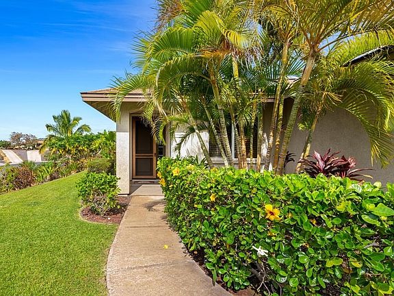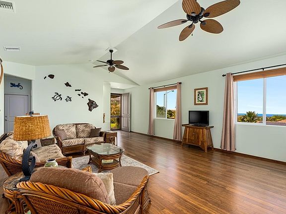 Positioned on a 11,468 square-foot lot for optimal air flow, the home's ceiling fans, central air conditioning, and a cathedral ceiling in the great room ensure a comfortable indoor temperature year-round. When you do need the AC, the home is energy efficient with both solar electricity (set up with net metering), and solar hot water. The kitchen contains new stainless-steel appliances, a farm sink, a large pantry, and room for a comfortable sitting area to enjoy coffee or breakfast. An outdoor lanai expands the living space and is a great place to dine while watching the sun drop into the ocean. The master bedroom enjoys a private lanai and the adjoining master bath includes double sinks and a tub/shower component. Two additional bedrooms share the second bath and either would be perfect as an office/study. Engineered bamboo wood flooring flows throughout the living spaces.