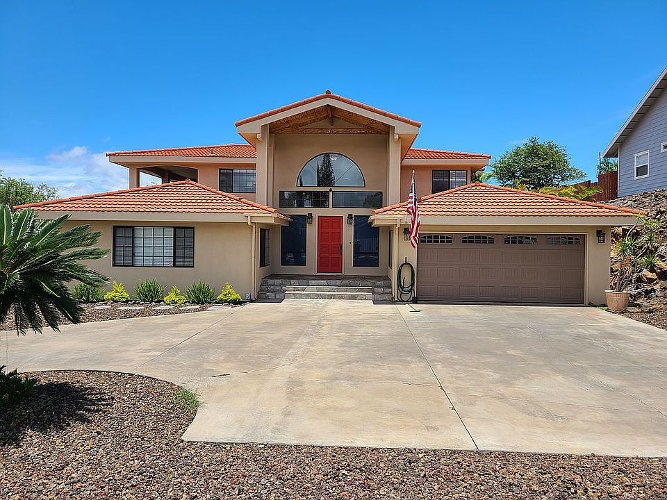 This beautiful Mediterranean-style home located in Waikoloa Village features a wide open floor plan that takes advantage of the gorgeous ocean view from the main living areas and master bedroom. Lots of windows let in the light and every room in the house has either a view of the ocean or one of Hawaii Island’s stunning mountains (Kohala, Mauna Loa and Hualalai). Set on a quiet cul-de-sac in the very back of the village, you are in your own paradise in this Lucky Bennett-designed custom home. The two car garage has plenty of space for two large vehicles and there’s is room in the driveway for four more. This home features a vaulted wood ceiling over the Great Room, stainless appliances, new convection stove and vent, extra large island and plenty of cabinet space, wood laminate floors in kitchen, dining and bath, ceramic tile counters with matching backsplash in kitchen, granite counters in the bathrooms. The Master Suite features a large bedroom with tray ceiling, ceiling fan and split AC to keep you cool, tile floor throughout and continuing into the oversized Master Bath. The MB also features a tray ceiling, a large soaking tub, dual vanities, large walk-in shower and private toilet. The master suite features plenty of flush lighting that is dimmable to match your mood. This is a split level home with the main living area, dining area, kitchen master suite and 2nd Bedroom and bathroom on the upper floor. On the lower level is the entry foyer, a large third bedroom/bonus room with full bath. This can be used as an office/man cave, second living room or a separate large bedroom/in-laws quarters (it is huge!). Large storage room under the stairs and the garage completes the downstairs. Covered lanai’s Off the living room and the master give breathtaking views of the ocean and the legendary Kohala Coast sunsets. Off the dining room, sliding patio doors open onto a large concrete lanai, perfect for an evening of stargazing and good conversation.