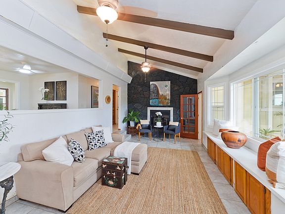 *Expansive Yard: There is a concrete patio that spans the length of the home, complete with shade cover and privacy-enhancing rock and fence walls. A mature Meyer lemon tree thrives in the herb garden area, while the side yard boasts a vibrant lawn and a fruiting mango tree. The front yard with tiered rock gardens, Norfolk pines for shade and lush landscaping captures the ocean views.
