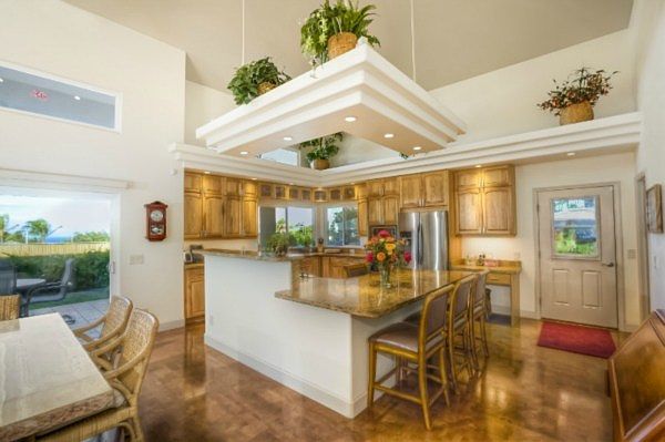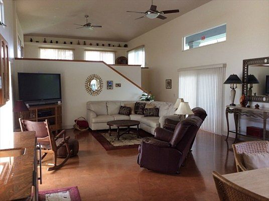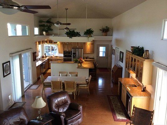 Enjoy many of the wonderful feature of this beautiful 3,391 sq. ft. home with views of the ocean, Mauna Kea, Mauna Loa, Hualalai and Maui. It is outfitted with a photovoltaic system, a full house water filtration system and a 120 gal. solar water heater and a tank less water heater for instant hot water in the master bath. There is an extra ice maker in the wet bar. This well designed home is illuminated with pecan cabinets, granite counter tops and cork flooring throughout. The huge office downstairs has a refrigerator and is plumbed for a sink, wired for a stove and has a full bathroom. It could also be a family room or rented out as a studio. Enjoy a variety of fruit trees.