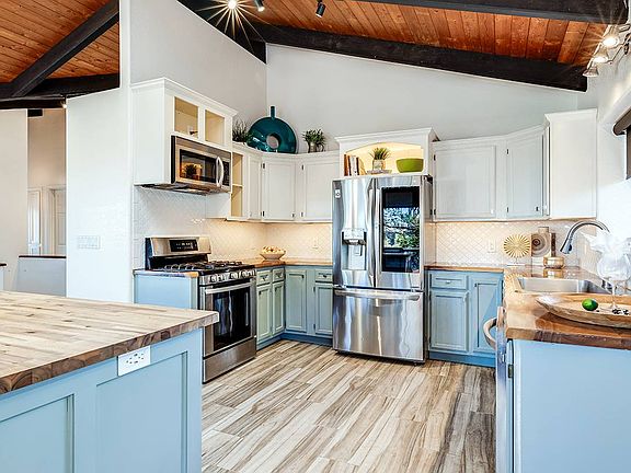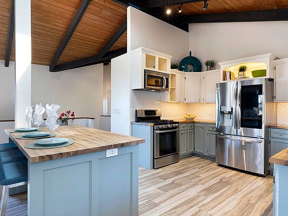 This home features an open floor plan offering ample room for relaxation and entertainment. The recently renovated Kitchen with custom built cabinets is the heart of this home and has been thoughtfully updated with a modern touch, featuring stainless steel appliances, Acacia wood live edge countertops and an abundance of storage for culinary enthusiasts. The open floor plan seamlessly connects the living, dining, and kitchen areas, creating an inviting space for gatherings. One of a kind stained glass artwork adds a special touch. Custom built in cabinets in the entryway can serve as additional storage space a unique coffee bar or buffet. Retreat to the large primary bedroom complete with an ensuite bathroom and large closets. Two additional bedrooms provide comfortable accommodations for family or guests. The interior boasts new paint throughout, the current owners have been lovingly upgrading this property, and their work is truly wonderful.