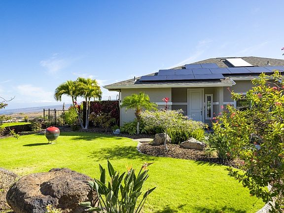 Welcome to Makai Vistas, Waikoloa Villages private gated community of only 29 homes. Located within Makai Vistas, this home is located on a cul-de-sac perimeter lot, sitting above the neighborhood below creating spectacular open space views of the Kohala Mountains, Ocean and Island of Maui in the distance. The home comes fully furnished! The floor plan features an open space concept, large granite kitchen island with ocean views, light bright dining area, and large windows in the living room. The primary suite is located on one side of the home while the other two bedrooms and bath are located on the opposite side of the home, creating privacy. This home still feels new with a true pride of ownership from the original owner. Upgraded features include air conditioning, outdoor garden shower, upgraded tile flooring throughout, upgraded bathroom tile, granite countertops, crown molding, full owned solar system with battery back up, custom blinds with blackout curtains, and a 3-car garage with double workstations. The attention to detail in landscaping feels like you have arrived in Hawaii. The covered lanai in the rear yard is perfect to host friends and family. The Waikoloa Village Association amenities nearby hosts a lap pool, tennis courts, and an 18-hole Golf Course.