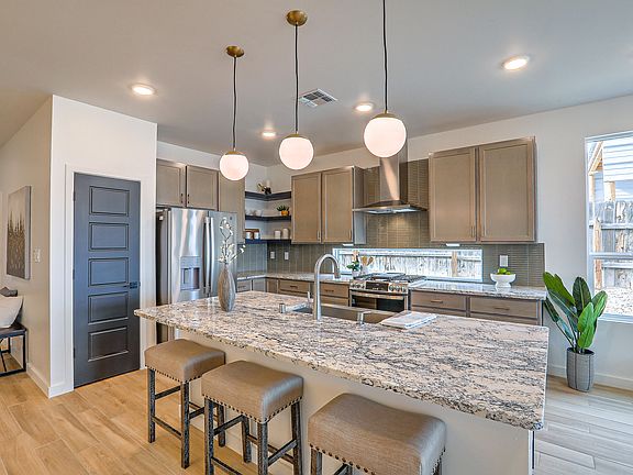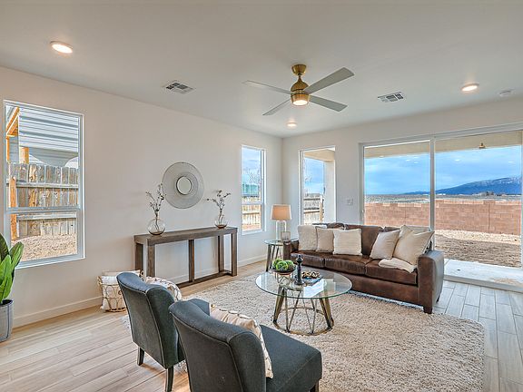 Seller offering 2% Concessions! New Home in Rio Rancho with Views built by Fellowship Homes! Multi-generation floor plan with 4 bedrooms, 3 full bathrooms and a 3 car garage on 1/2 acre lot! Fully Functional Flex-suite which includes full bathroom, separate entrance, and kitchenette perfect for home business or kid in college! Modern feel with 9 foot ceilings, wood look tile flooring and flexible layout. Open great room invites easy entertaining including a separate Dining Room. Gourmet kitchen with granite counter tops, washed grey & blue shaker cabinets, breakfast bar and spacious pantry. Beautiful master suite with its own en-suite bath with free standing tub and shower and large walk in closet. Plenty of luxury features: refrigerated air, blown-in insulation, low-e windows and more!