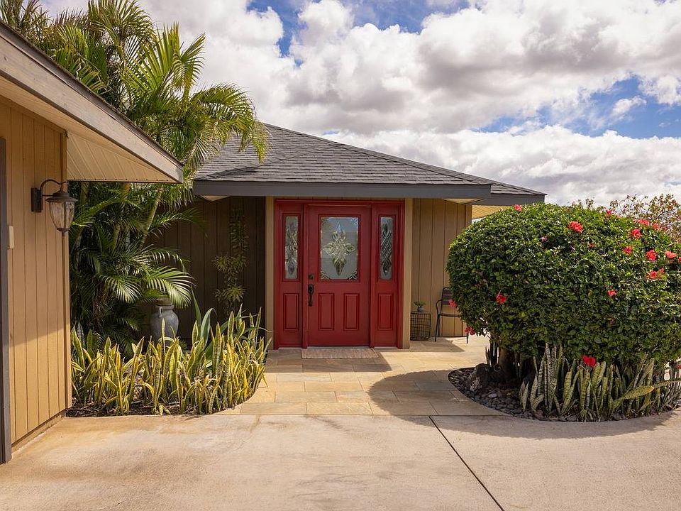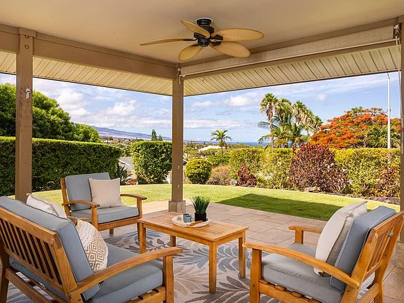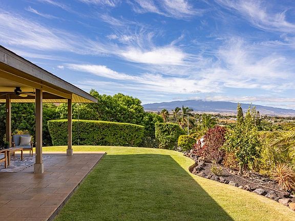 The views call to the outside to a large tropical lanai. Unwind & take in breathtaking Mauna Kea & distant sparkling ocean views. A yard with year-round lush green grass & tropical plants provide a tranquil setting for outdoor relaxation & entertaining.The beauty of this home extends beyond its walls, as you'll be treated to spectacular sunsets that paint the sky in a symphony of colors each evening.