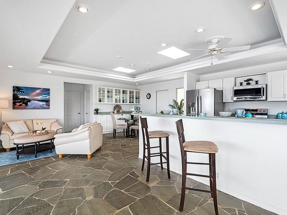 - Kitchen has stainless steel appliances & Corian countertops w/a long breakfast bar for add'l seating