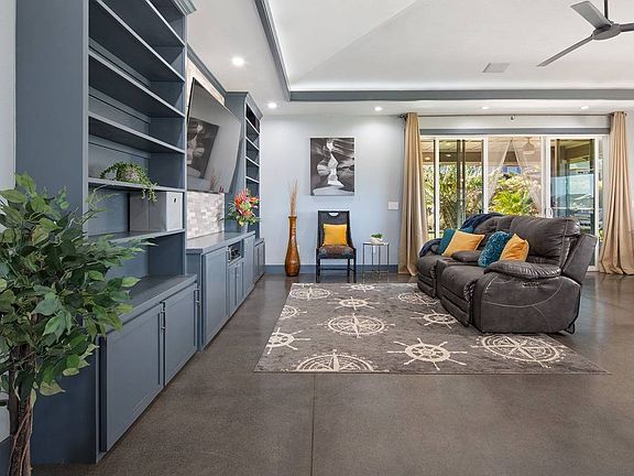 ~Voluminous great room, built-in entertainment wall, wired sound system, coffered ceiling w/up-lighting