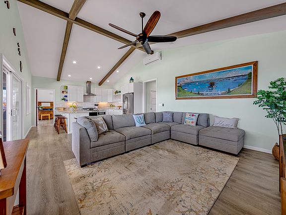 Great Room Oasis: Experience the grandeur of a 13-foot vaulted ceiling with exposed beams, creating a comfortable living space with direct access to the expansive lanai.