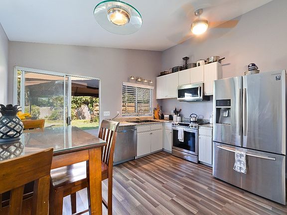 The Primary Bedroom with an en suite features a walkout sliding door to the back patio and yard. From the “Mountain” guest room you can enjoy waking up to the views of the beautiful slopes of Kohala Mountain. Great for entertaining, the flat private spacious backyard has a patio with a gazebo, partially fenced in with views of Kohala Mountain and Mauna Kea. Added bonus of being a corner lot, there is a gravel driveway off of Hulukoa Pl with direct access to the backyard.