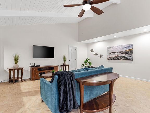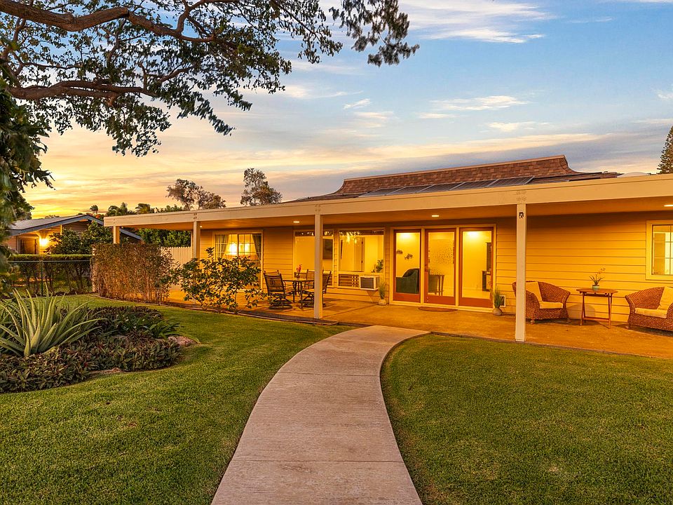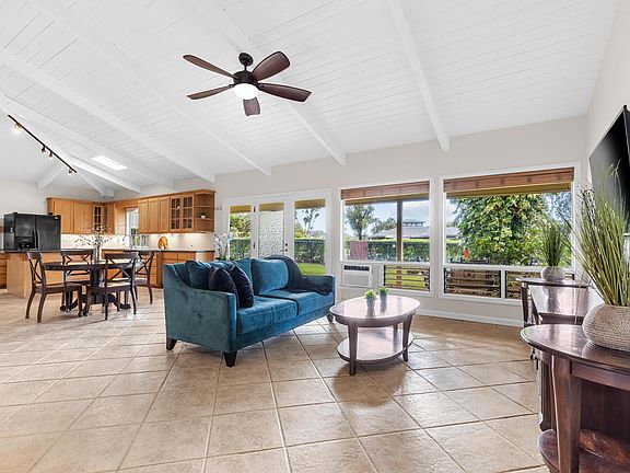 Relax and dine on the spacious covered front lanai, overlooking your private garden filled with a beautiful large monkey pod tree, exotic monstera, mature traveler palms, and other tropical plants. The main living area features large picture windows that offer lovely views of the lush greenery.