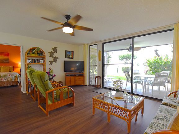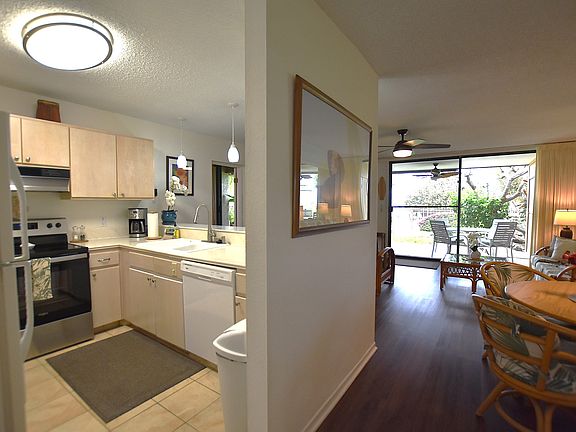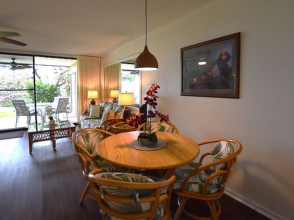 Discover serenity at this single-story ground floor condo nestled in Waikoloa Villas, offering views of the ocean and the Waikoloa Village golf course. Relax on the oversized lanai amidst lush tropical grounds, where wild turkeys roam and vibrant sunsets illuminate the sky. The lanai is the perfect spot for enjoying your morning coffee or evening cocktails. This condo is just a few steps away from one of the two inviting pools. Waikoloa Villas features two swimming pools, spas, cabanas, outdoor kitchens and BBQ areas for your enjoyment.