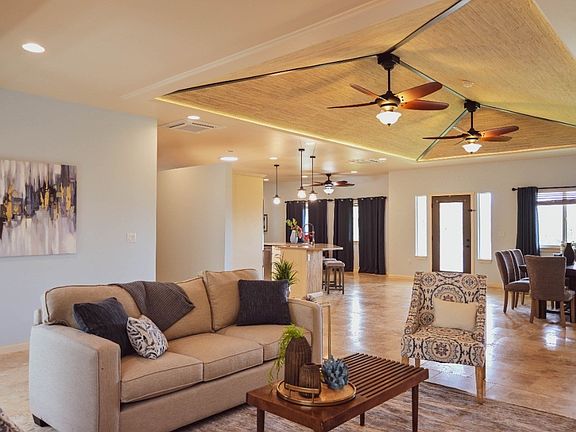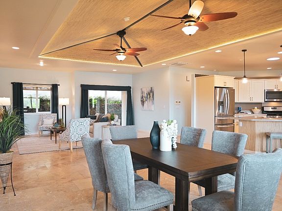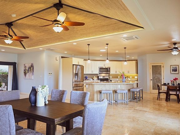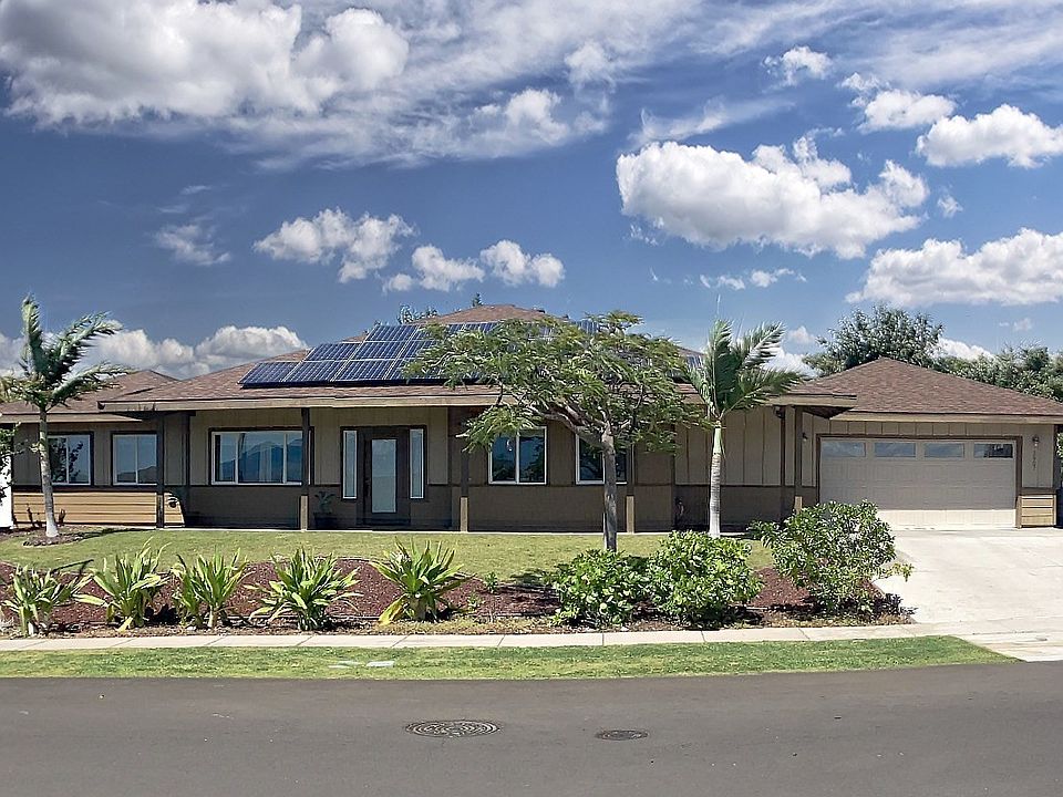 Welcome to Kihaka at Wehilani a small exclusive community based at the gateway to Waikoloa Village. Total photovoltaic home includes large open concept single level 3 bedroom 2 baths features Travertine floors throughout, elaborate hip style open ceiling in living room and master bedroom. Kitchen has gas appliances, tankless hot water and dryer. There is a pantry and separate laundry room conveniently located near the kitchen area. The master bedroom has a walk in shower and walk in closet plus double sinks. Skylights are located in the kitchen, hallway and master bath. Energy efficient fully insulated home that has a total photovoltaic solar system completely paid for (no lease) with 21 panels with string inverters plus 2 Tesla Power Walls. Includes EMP surge protection for the entire home, and both panels and inverter. Air conditioning throughout the home and garage. Garage has epoxy floors and built in metal storage cabinets as well as an upright freezer. Includes a whole house water filtering system. Vinyl fencing surrounds the entire back yard which includes fruit trees, tangelo, tangerine, lemon, mango, moringa, figs, mountain apple, soursop and avocado. Three vegetable garden beds with 50' of sunshade installed and drip irrigation. Close to premier Hawaii Beaches and Resorts. Minutes to the new Waikoloa Plaza, Post Office, gas station, fitness center, hardware store, bank, grocery stores and restaurants. Access to newly built aquatic center, golf course, stables and tennis court. Waikoloa Village Association and Kihaka at Wehilani Association dues subject to change. Seller to cover HOA fees for remainder of 2023. Current owner has a VA loan which is assumable for eligible veterans. Home has been staged-Furnishings not included.