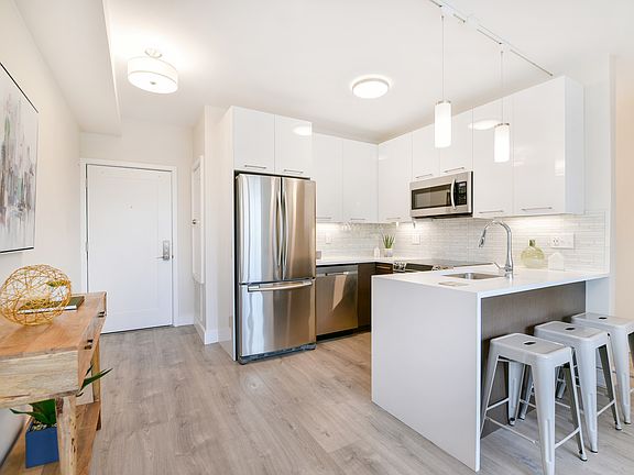 Jeffries Point two bedroom with garage parking in a new construction elevator building located 900 feet from the Blue Line! This sunlit corner unit is highlighted by large double windows, high ceilings & warm neutral finishes throughout. An inviting open concept floor plan features a bright, modern kitchen with Ceasarstone waterfall peninsula, two tone cabinetry, textured glass backsplash, digital Samsung stainless steel appliances, dining area & ample space to entertain. Two equal size bedrooms share a large bath with hexagon mosaic flooring & walk-in shower. Samsung washer & dryer, Central heating & cooling, video intercom, USB outlets, professionally managed HOA, pet friendly building with bike storage. Live steps to Maverick Station on the Blue Line, restaurants, shops, Crossfit, yoga, Bremen Street Dog Park & East Boston Greenway.