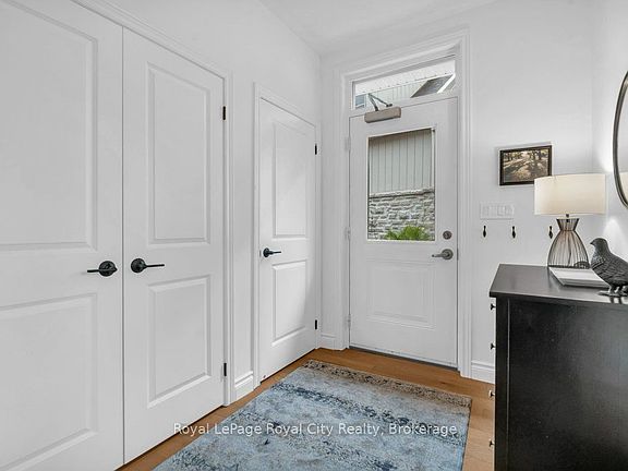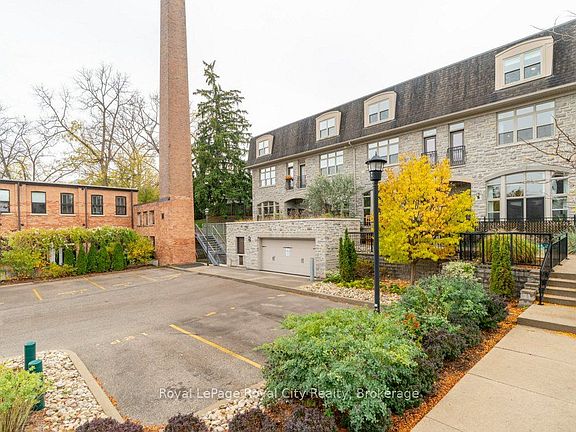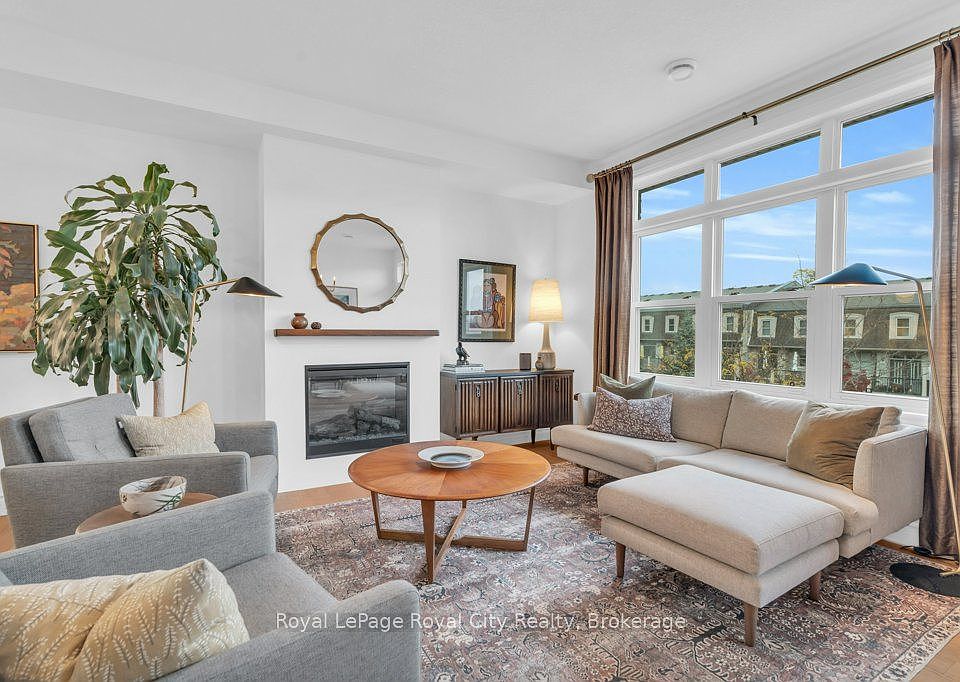 This minimalist mid-century inspired modern home in the highly sought-after Stewart Mill Townes on Cardigan Street is design-magazine ready. Perfectly positioned between Exhibition Park and Downtown Guelph, with Goldie Mill and the Guelph Youth Music Centre just across the street, it is the ideal blend of urban convenience and serenity. This 2,000 sq. ft. end unit with a two-car garage (parking for four) and access to secluded, condo-maintained gardens has been thoughtfully reimagined over the past four years. Every detail has been considered, from smart wall placements that create multi-purpose spaces, to built-in storage that maximizes efficiency. The Hayes Custom Woodworking kitchen features elegant slim-shaker cabinetry, a stunning penny tile backsplash, and clever design that makes it as practical as it is beautiful. The custom-built living room fireplace with a striking teak mantel, creates a warm, cohesive main floor that invites gathering and relaxation. A main-floor office provides the perfect space for remote work, a TV lounge, or a guest bedroom. Upstairs, the second bedroom features three large windows and an updated ensuite. A smart partition creates additional functional space, perfect for a hobby nook, wellness area, or small office. If desired, this space could easily be reconfigured to accommodate a third bedroom. The primary suite is a stunning retreat where, again, beauty meets function. A custom privacy wall defines a flexible space ideal for a dressing room, home office, or cozy reading corner. The five-piece fully updated ensuite features a vintage teak vanity and a timeless design with bold, tile detailing. Storage is abundant throughout, including a loft inside the home and additional storage above the garage for seasonal items. This rare, one-of-a-kind home in Stewart Mill Townes blends intentional design, comfort, and modern living in one of Guelph's most desirable neighbourhoods.