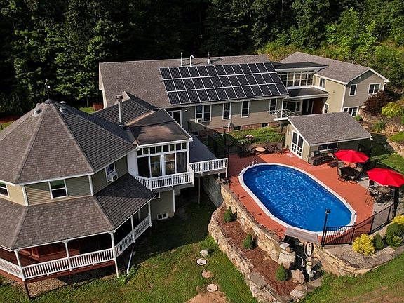 One of a kind Property, great for multi generational living or perfect for a contractor that needs ample space and wants an income generating property while supplementing costs. The property offers 6000 sq feet of living quarters the home features 3 bedrooms all with an ensuite, a primary bedroom with 2 additional rooms great for office space and an additional private bonus space off the primary that can be used as a separate den if desired, and a sizable kitchen/ dining area that has a porch leading out to the pool area which is great for entertaining friends and family. There is a sizable additional space with a kitchenette and bath that would be fantastic for a family member or spoiled teenager that if you give this space to may never fly the coop. The attached in-law is an updated and spacious 1 bedroom with private entrance and parking. Solar that is owned makes for affordable utilities, owned propane tanks for gas heat, huge garage space, 15 mins to Amherst MA.