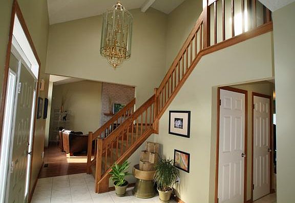 Two story foyer open to great room with cathedral ceiling and floor to ceiling brick fireplace. Large kitchen w/ ceramic tile floor and stainless steel appliances, formal dining room with bay window, 1st floor office, 1st floor laundry room, 4 bedrooms, master bath with whirlpool tub and separate shower. Dream yard, beautiful landscaping, and large shed back up to green space. "Look at the square footage!".