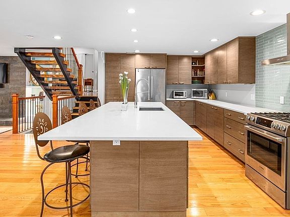 • Kit Dscrp: Dining Area, Flooring - Hardwood, Cabinets - Upgraded, Kitchen Island, Stainless Steel Appliances, Open Floor Plan, Recessed Lighting, Countertops - Upgraded, Remodeled, Slider, Exterior Access, Gas Stove