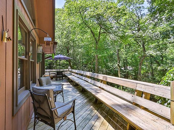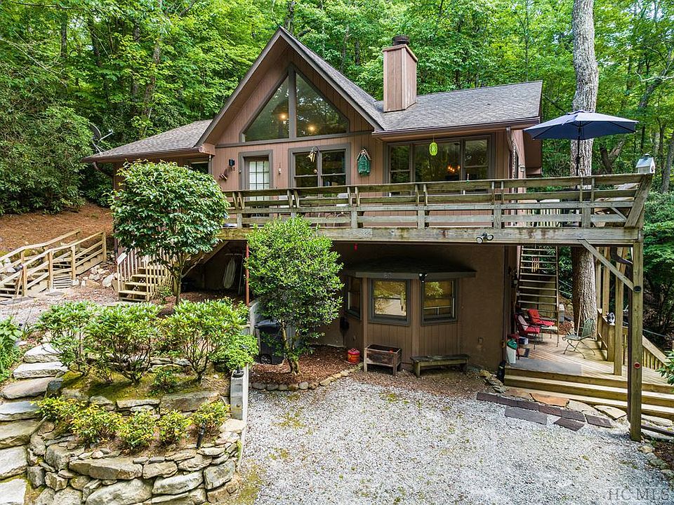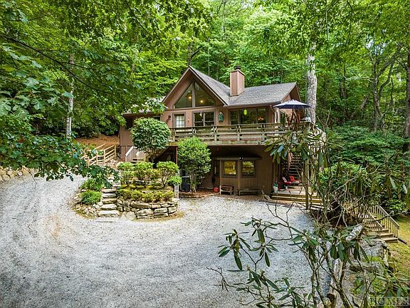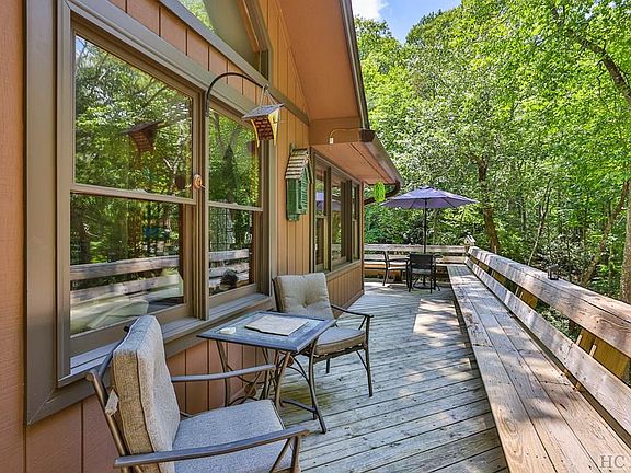 With a prime location in the heart of Cashiers, this mountain-style home is situated at the end of a road, offering peace and privacy. The home features two bedrooms and two bathrooms, each thoughtfully positioned to maximize privacy. The living and dining rooms boast vaulted ceilings and are divided by a double-sided fireplace, creating a warm and inviting atmosphere and multiple access points to the wraparound deck. The kitchen has been beautifully updated to include modern amenities and an expansive island that serves as a social hub, ideal for guests to gather and chat with the host during meal preparation. On the lower level, there is a spacious area that includes an additional kitchen and bathroom. This space is perfect for accommodating guests or could be transformed into an entertaining game room. It also includes a large storage area. Outside, the property is enhanced by a small stream and includes a shed for storing all kinds of outdoor equipment. This house is not just a place to live, but a wonderful setting for making lasting memories.