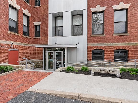 Located at the Residences at Franklin School, this beautiful corner penthouse, with splendid views of Boston, offers a bright, open floor plan. The layout, with a living room, dining room, and eat-in kitchen, features a two-story high ceiling and French doors opening to a private balcony. The stylish kitchen has an island, granite countertops, stainless steel appliances, and gas stove. There are two bedrooms, two bathrooms, and a loft. The primary bedroom has an en suite bathroom with soaking tub and separate shower. In addition, the unit has a laundry room, an exposed brick wall, beamed ceilings, recessed lighting, hardwood floors, and central air-conditioning. Two parking spaces are included. This professionally managed building provides elevator service, extra storage room, guest parking, and manicured grounds. Shops, restaurants, and public transportation are all close by.