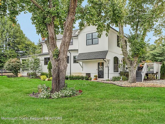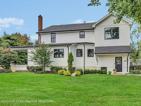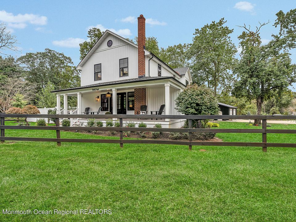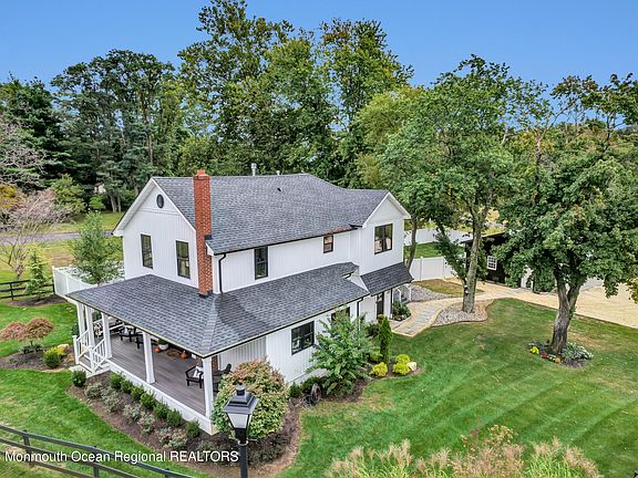 Location, location, location...charm, character, and craftsmanship abound in this 1910 farmhouse located in the heart of Colts Neck! Completely renovated and expanded in 2019 designed for comfort, style, and easy living. The white board and batten home is paired with a 2.5 half car - black barn-style garage with a high vaulted ceiling and metal clad roof. Entering from the original side Dutch door, you are immediately welcomed into a sun filled entry with mudroom. Quickly up the short staircase invites you to an open living and dining floor plan with large sun-filled rooms with abundant character featuring French oak flooring, a culinary kitchen with Viking appliances, a custom white quartz countertop, and a large functional islandIndulge in an artisan paneled double sided gas fireplace. creating a Cozy environment during colder nights. Other features include handmade wooden beams detailing the ceiling. Upstairs are three large bedrooms with a modern jack n jill-style bath with a well-appointed walk-in shower and vaulted 14' trey ceilings. The primary bedroom suite is a true sanctuary featuring 18 ceilings, a beautiful soaker tub, and a custom enclosed glass shower. Additionally, this home includes a 700 sq. foot lower level with a lovely private 4th bedroom with detailed finishes. Rounding out this home includes black Andersen windows, a custom front door with a new front porch, white beadboard ceiling, a new roof, dual zone Nest controlled high-efficiency HVAC system, tankless water heater, new electrical, plumbing, Wi-Fi-controlled sprinklers, a fenced yard with expanded deck for outdoor dining and grilling.