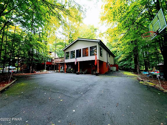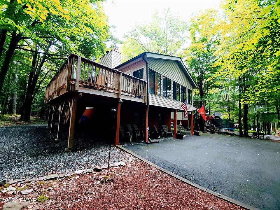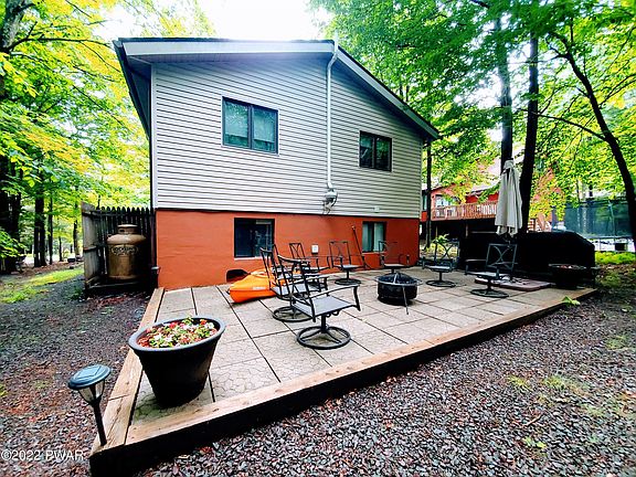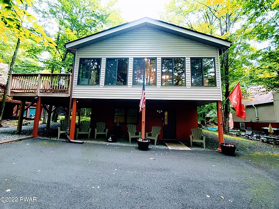 Your Vacation Retreat Awaits and it's being sold furnished! This extremely well-maintained home is the perfect getaway. Tastefully updated throughout with a relaxing outside space complete with a hammock hanging in the shade. Newly built deck offers plenty of room for your summer BBQ's as well as the patio area to sit around the fire. Enclosed porch area features lots of natural light, heated, and plenty of space for family board game nights. Property also features a stone-faced wood burning fireplace, three bedrooms, modern kitchen with stainless steel appliances and butcher block island, modern bathrooms with jetted showers, and a lower-level family room. Home is located in an amenity filled community, featuring lakes, beaches, ski slope and so much more Only 2 hours from NYC and Philly!