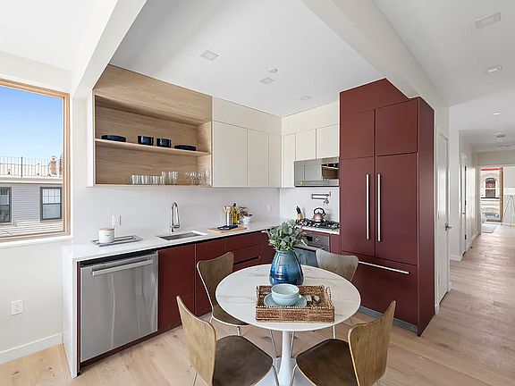 An elegantly crafted condo nestled in a quiet residential enclave in Bushwick, this brand new 2-bedroom, 2-bathroom home has private outdoor space and offers a laidback Brooklyn lifestyle close to public transportation and local restaurants, bars, and cafes. Floor-to-ceiling double-glazed Pella windows let in an abundance of natural light, highlighting beautiful wide plank pre-finished white oak floors and high ceilings with recessed lighting. Daikin multi-zone split units provide precision temperature control in every room. Residents are greeted by an open-concept living room, dining room, and kitchen that flows out onto a private balcony perfect for sun lounging. The custom Nobilia kitchen boasts chic Silestone countertops and backsplashes, wall-mounted pot filler, Summit wine cooler, Grohe faucet, and integrated high-end appliances from Bertazzoni and Fisher & Paykel. The primary suite has double reach-in closets and a serene en-suite bathroom with imported Spanish tile walls and floors, a custom double vanity, oversized vanity mirror with built-in storage, floating Fine Fixtures toilet, and a walk-in shower with smart-touch Grohe fixtures. The second bedroom has a deep closet and easy access to a second full bathroom. The home comes with a Samsung washer and vented dryer. 68 Eldert Street is a boutique condominium close to bustling pedestrian strips like Broadway and Bushwick and Wilson Avenues. Nearby greenspaces include Saratoga and Irving Square Parks, and accessible subway lines include the J/Z/L. The building has a furnished lobby and elevator as well as a video intercom system, internet pre-wiring, and a common rooftop deck with private cabanas available, a BBQ hookup, and picturesque city views. Pets are welcome. Disclaimer: The complete offering terms are available in an offering plan from the Sponsor, 68 Eldert Street LLC, located at 289 Meserole Street Brooklyn, NY 11206. File No. CD22-0012. Equal Housing Opportunity.
