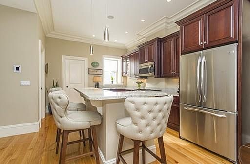 Located in the coveted Thomas Park neighborhood this gorgeous 2010 gut renovation parlor/garden duplex has 2 bedrooms, 2 full marble finish baths, open kitchen with granite counters, stainless steel appliances and island with pendant lighting, parlor level living / dining room plus lower level family room (could become 3rd bedroom), high level of attention to detail and craftsmanship throughout with large crown moldings, hardwood floors, recessed lighting, in-ceiling built-in speakers with iPod dock, in-unit laundry, 2 gas fireplaces and large private patio. Located in an exciting South Boston location close to restaurants, shops, public transportation and the nearby waterfront beaches/harbor walk.
