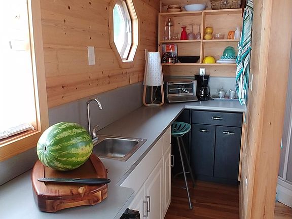 Weekly or monthly rental Immaculate Tiny with queen Murphy bed, cable, internet, city water & sewer, great people, fun campfires and guitar on the weekends just 3 short blocks from the water & beautiful beach. Lots of outdoor patio area for your use with nice furniture and umbrella. No stove but there is a great Cuisinart convection oven. AC and privacy blinds. She is parked in a seasonal family owned adult RV resort. Weekly rentals only $800 or $3000 per month Season opens May 11, 2019 through October 15th, 2019 A new beautiful and roomy TINY HOUSE 3 blocks from the beach. Location Flags RV Resort 68 Garrison Ave York Maine. PARK FILLS FAST. No smoking of any kind inside and must secure and cover patio furniture in on rainy days. Bring your own towels nd linens and paper goods, House is comfortable supplied with dishes, coffee maker, mugs etc.. weekly rentas are available as well for 800 per week