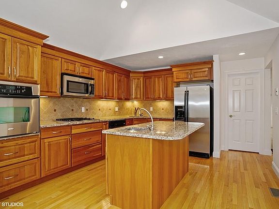 - Kit Dscrp: Flooring - Hardwood, Countertops - Stone/Granite/Solid, Recessed Lighting, Ceiling - Cathedral, Dining Area, Kitchen Island, Gas Stove